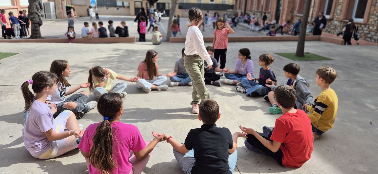 Tous les jours avant de rentrer en classe à 13h20, les CM2 chantent ensemble une comptine avec les mains.