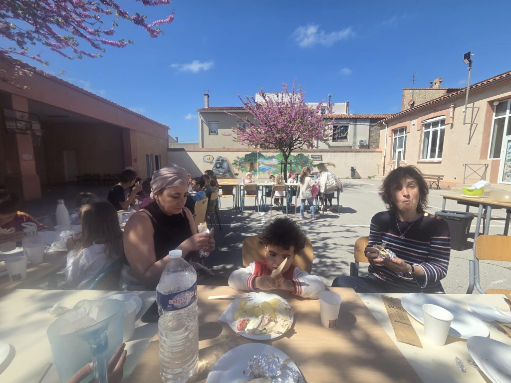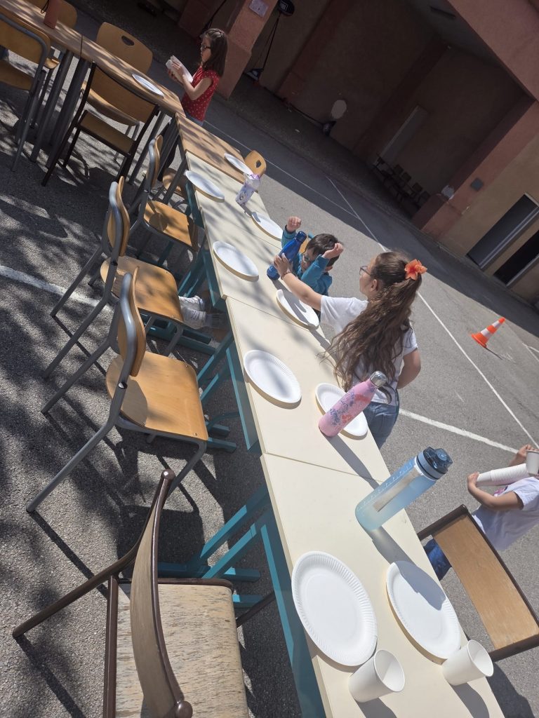Ce mercredi, les enfants ont eu le plaisir de confectionner des wraps, installer les tables dehors pour manger et profiter du soleil. Plusieurs enfant ont eu des rôles bien définis et chacun à pu être acteur actif de son temps de repas. Au désert, donut nappage chocolat…. Trop bon