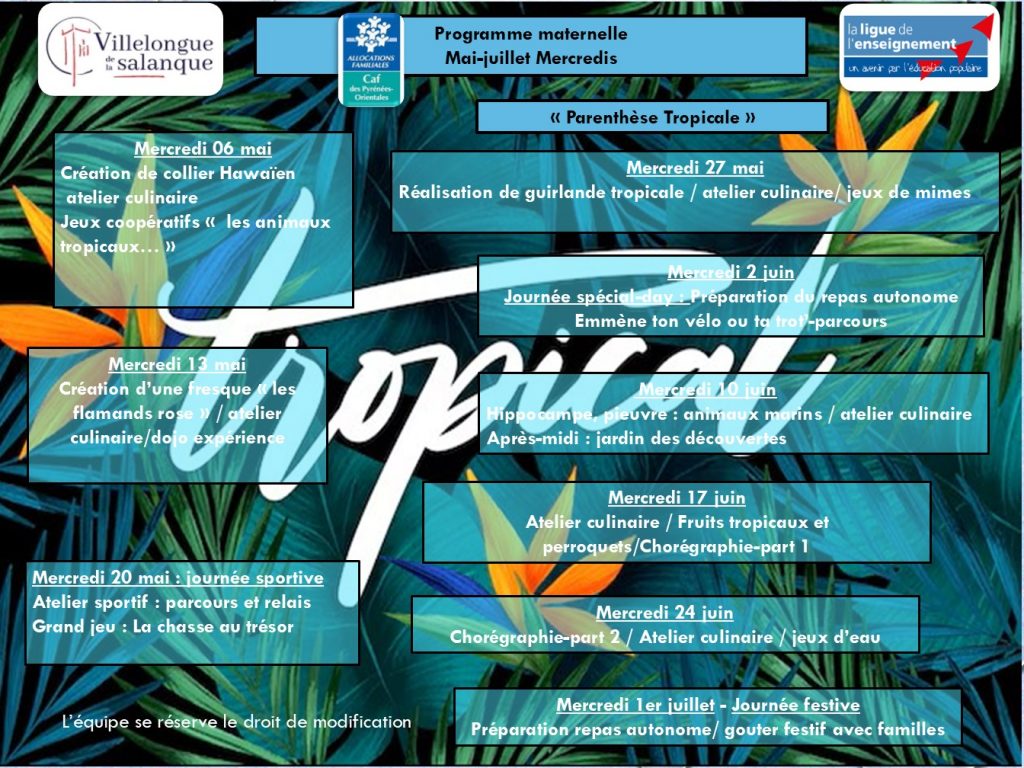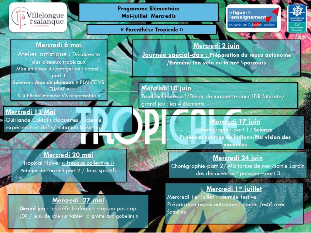 Programme mercredis Mai à juillet Par alsh.villelonguesalanque17 avril 2026Villelongue-de-la-Salanque Bonjour, Ci-joint le programme des activités pour le cycle des mercredis de mai à juillet. Embarquement immédiat pour une escale tropicale. Nous vous attendons….