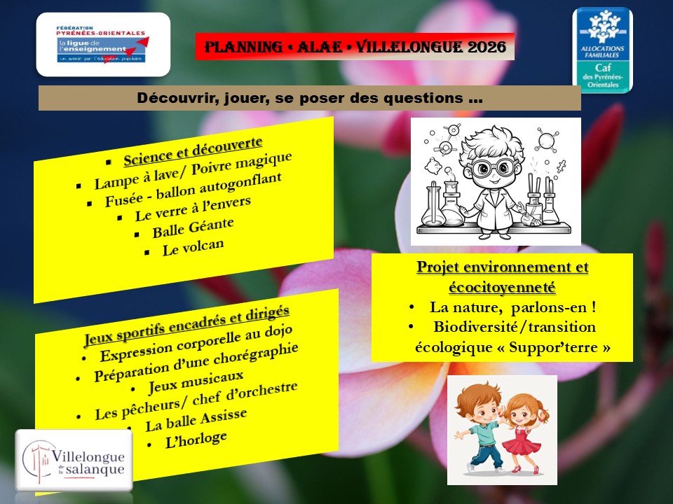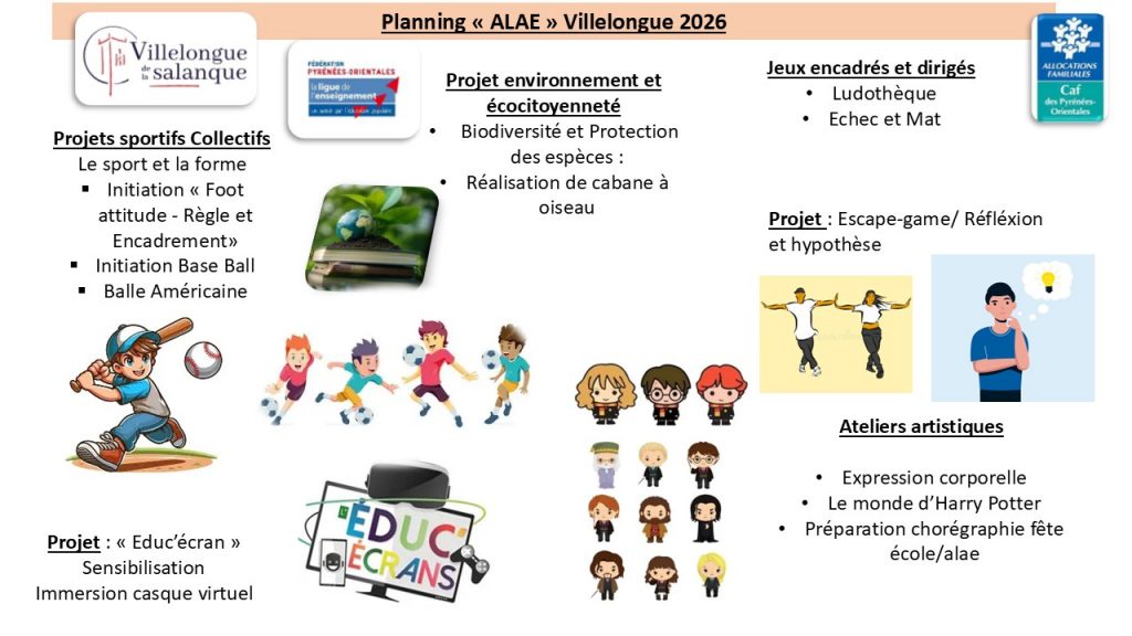 Programme périscolaire – pause méridienne- mai à juillet Par alsh.villelonguesalanque17 avril 2026Villelongue-de-la-Salanque Programme Maternel : Découverte et expérimentation et jeux sportifs coopératifs. Programme élémentaire : Sport, éduc’écran, protection animal et projets sportifs collectifs.