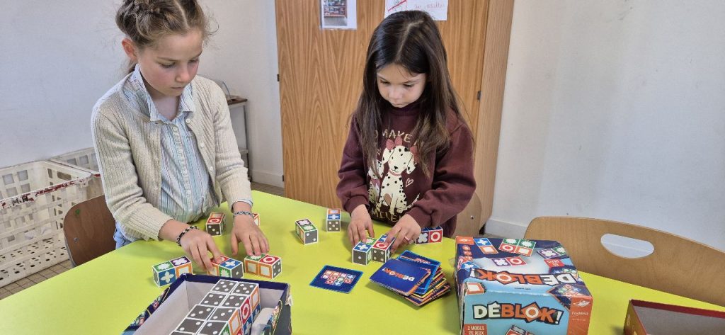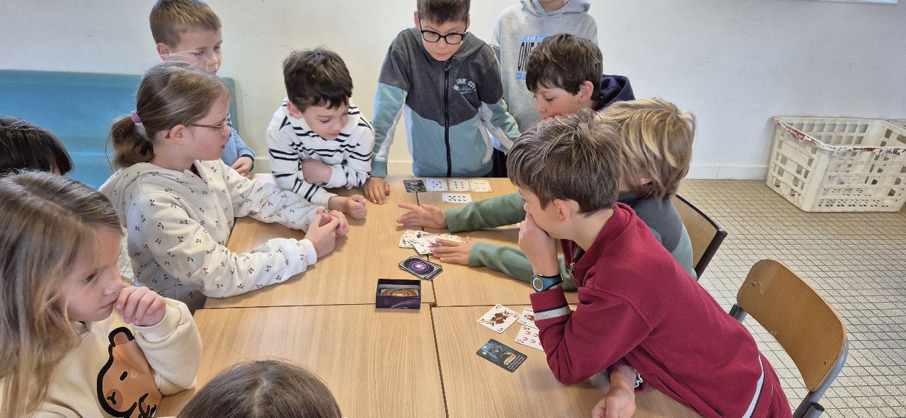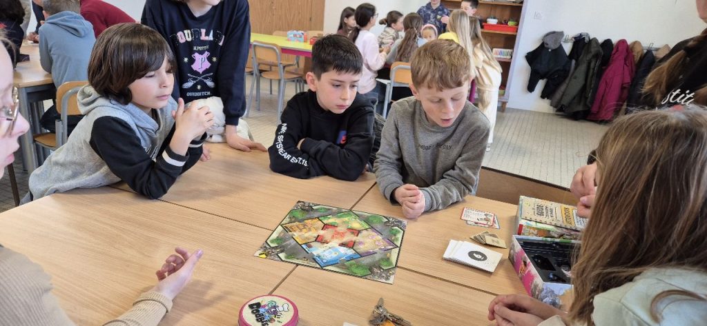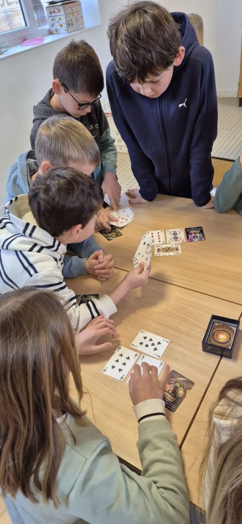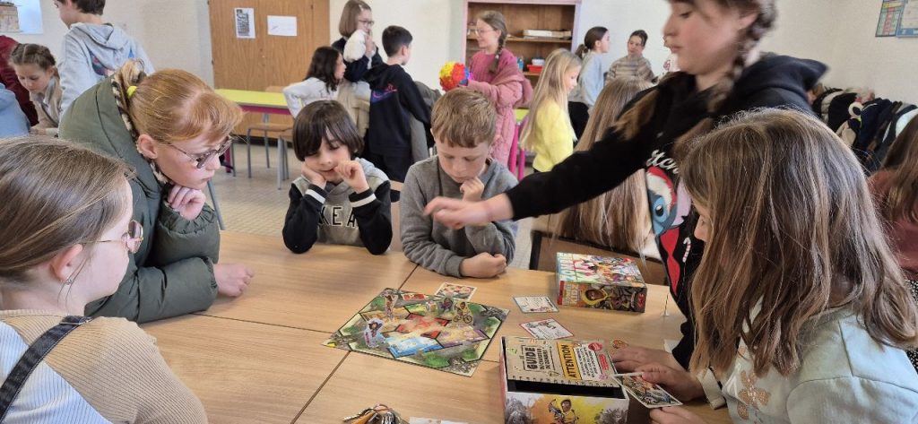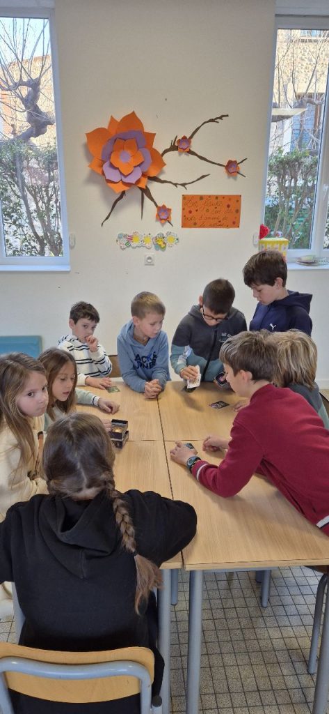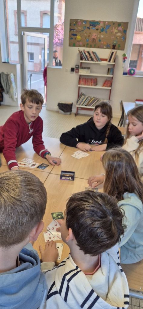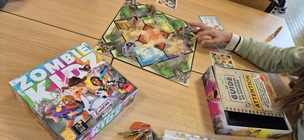 Comme tous les matins, les enfants sur ce temps d’accueil choisissent de faire des jeux de sociétés. le jeu qui à la côte en ce moment est un jeu de carte « la bagarre ». Mais dans chaque coin de la salle, on se pose, on discute et on joue. Il y a aussi Gina, qui a emmené son jeu « Zombie Kidz » pour nous le faire découvrir.