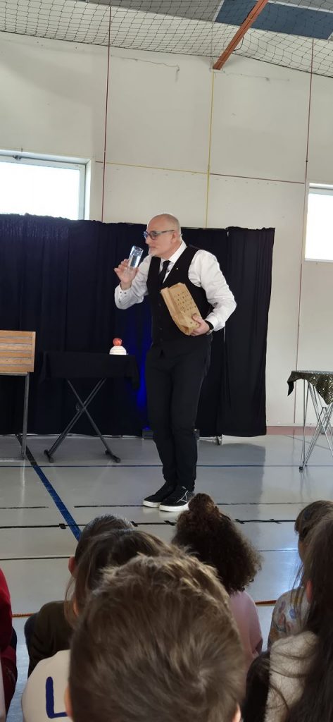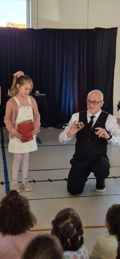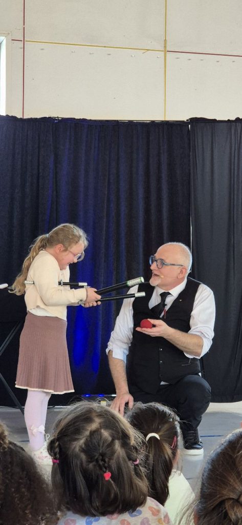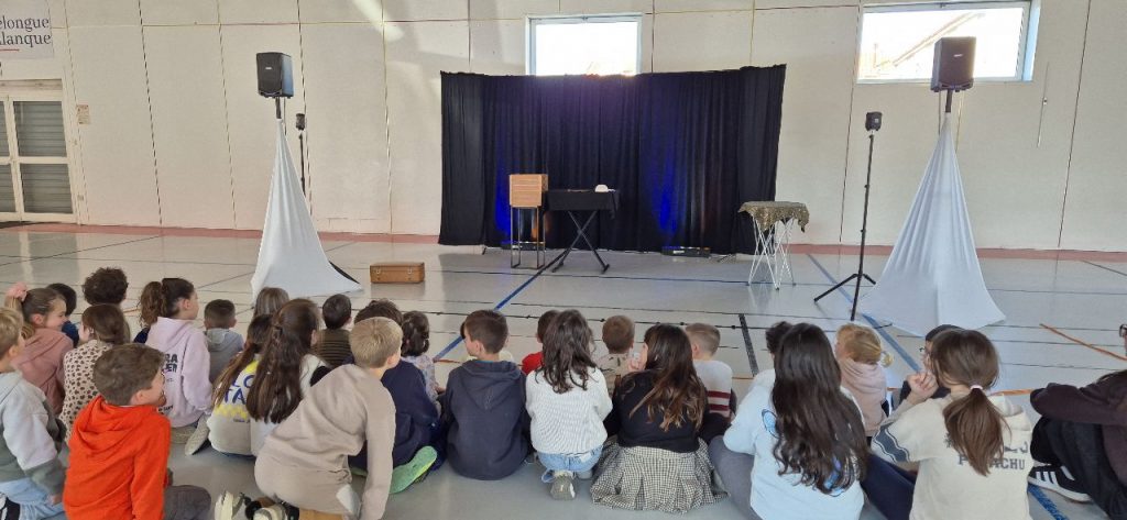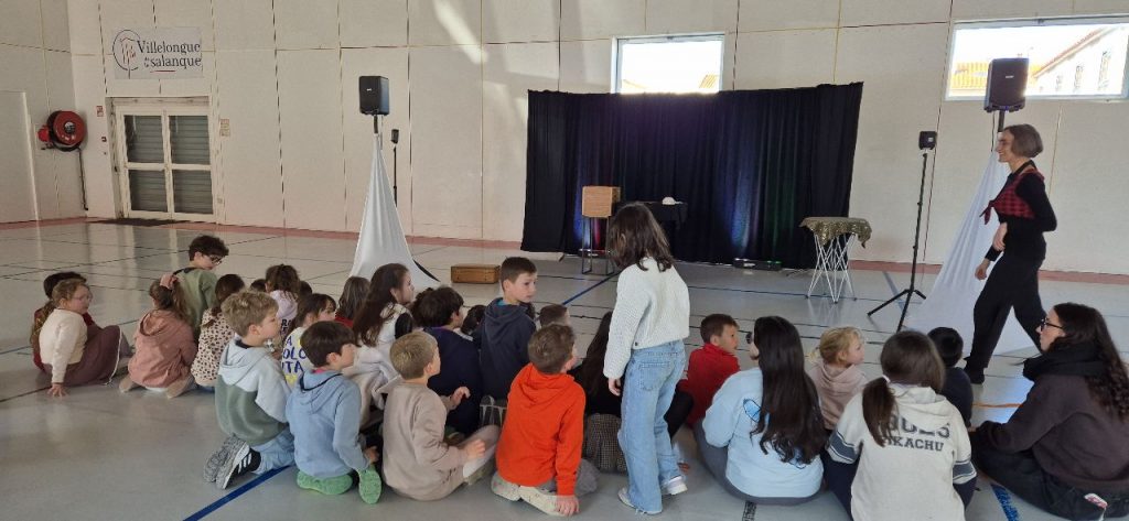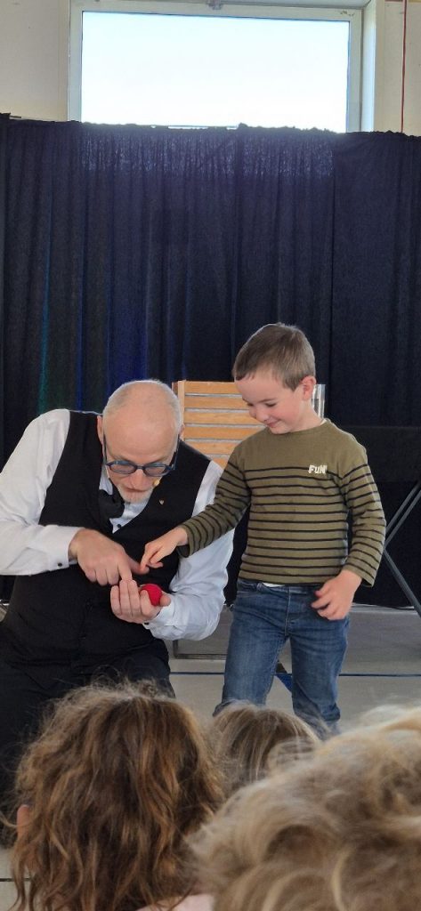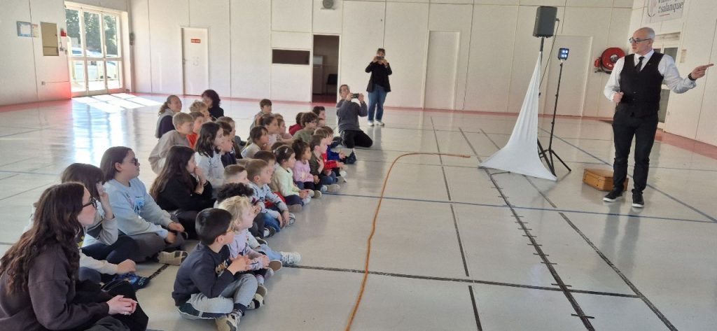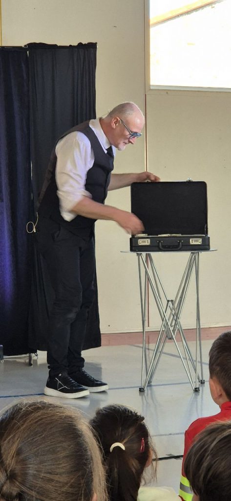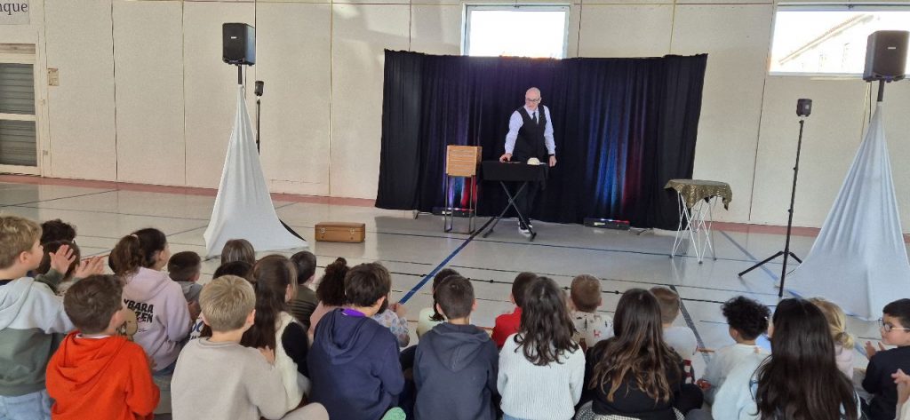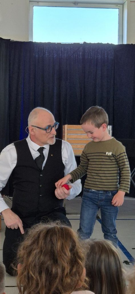 Les enfants, émerveillés, se sont laissés emporter par un univers plein de surprises et d’illusions. Entre rires et regards ébahis, ils ont même participé activement aux tours en lançant des balles… imaginaires ! Et comme par magie, celles-ci reprenaient forme dans des poches en papier, provoquant étonnement et éclats de joie dans toute la salle.