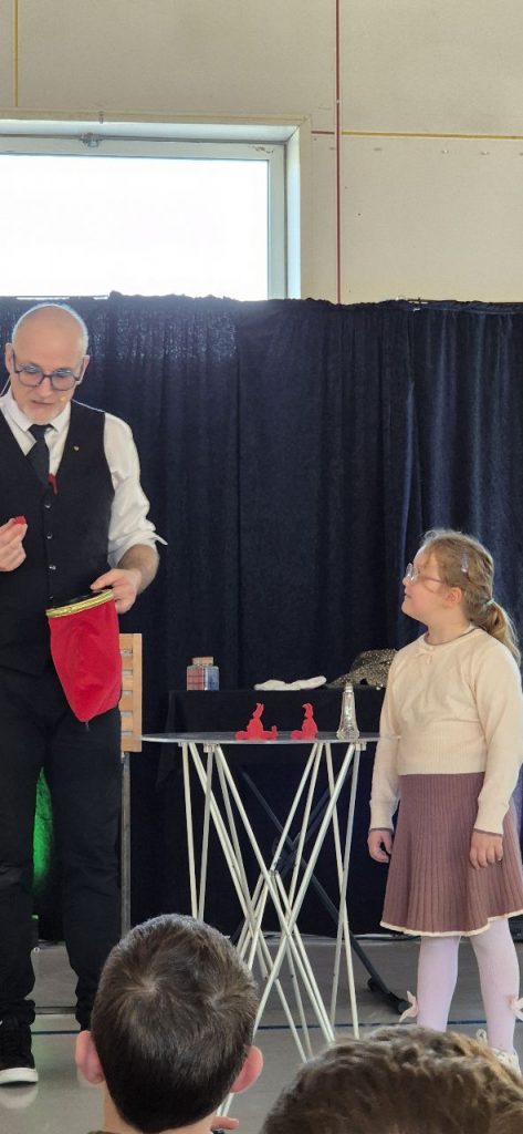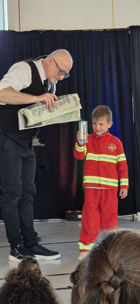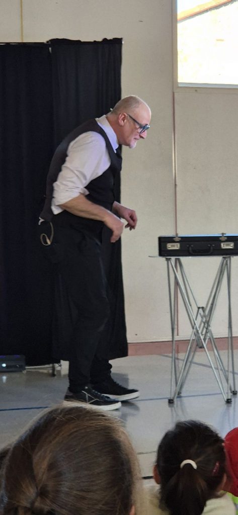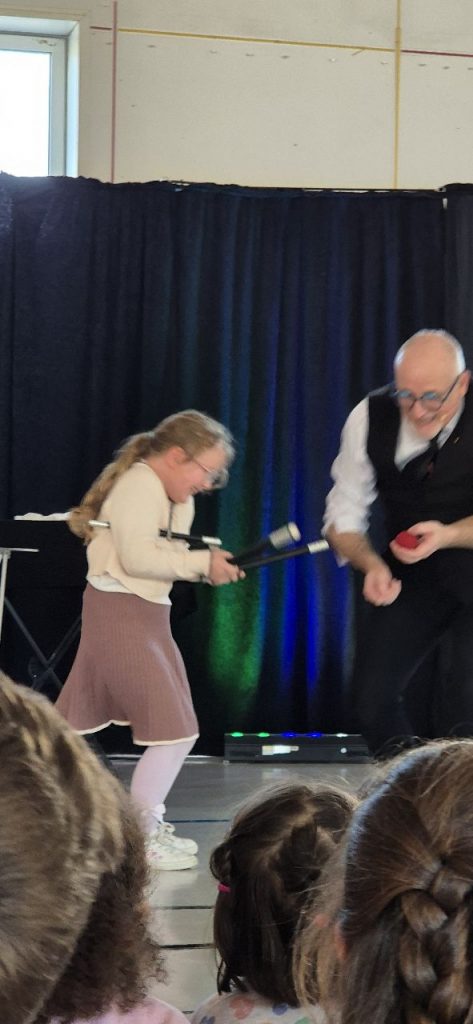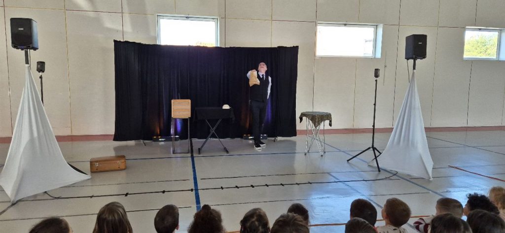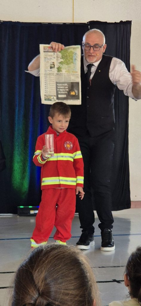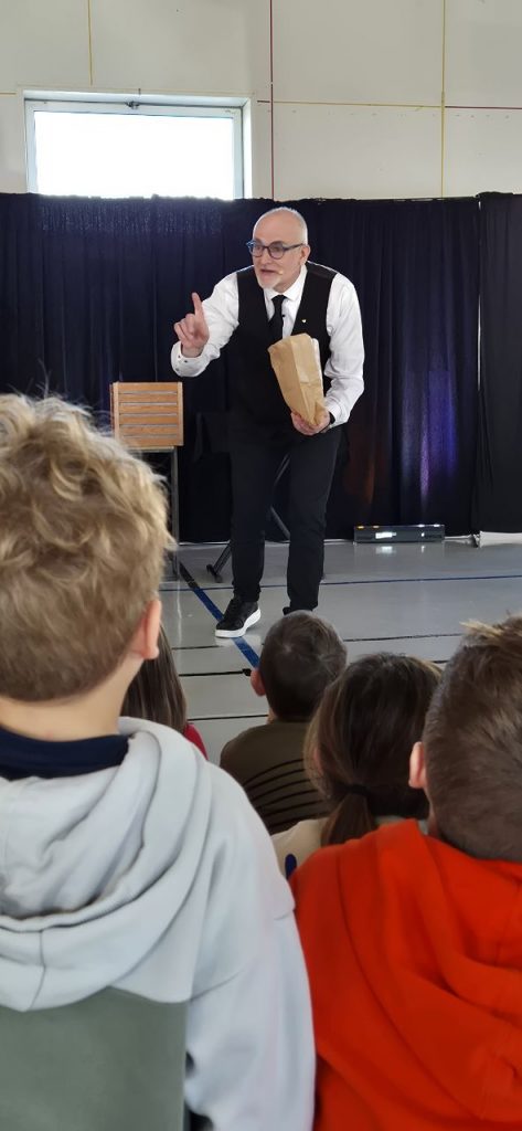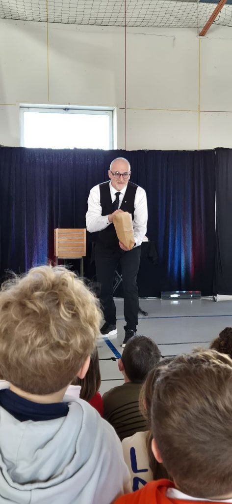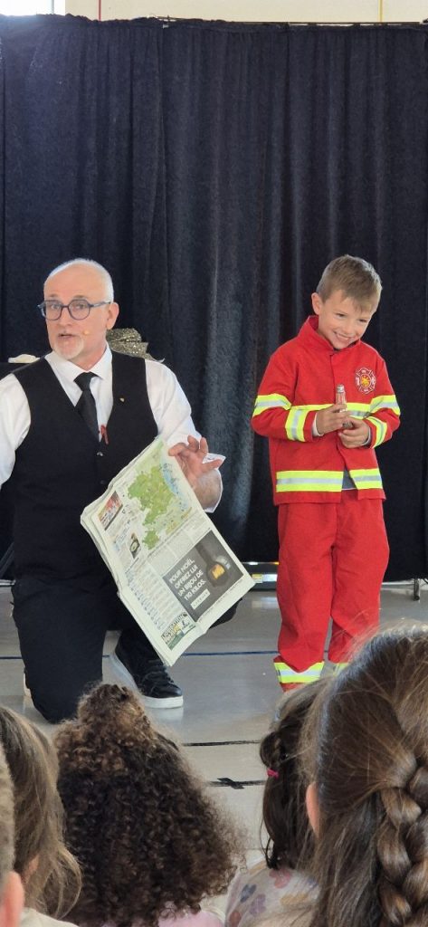 Les enfants, émerveillés, se sont laissés emporter par un univers plein de surprises et d’illusions. Entre rires et regards ébahis, ils ont même participé activement aux tours en lançant des balles… imaginaires ! Et comme par magie, celles-ci reprenaient forme dans des poches en papier, provoquant étonnement et éclats de joie dans toute la salle.