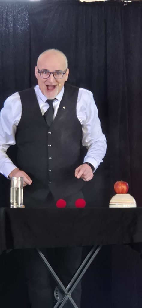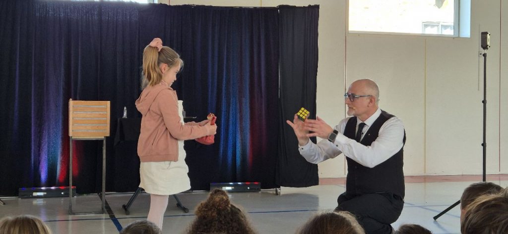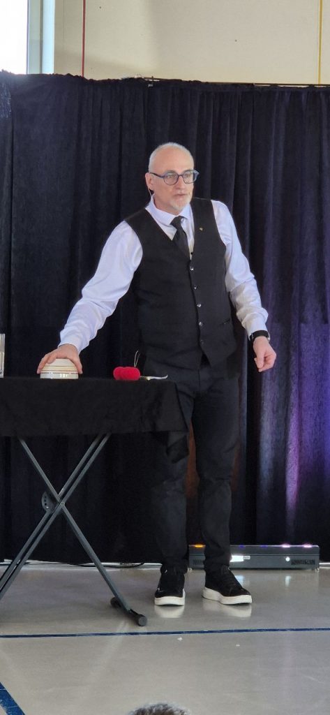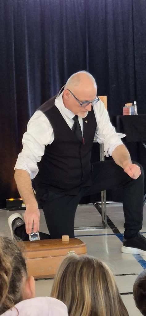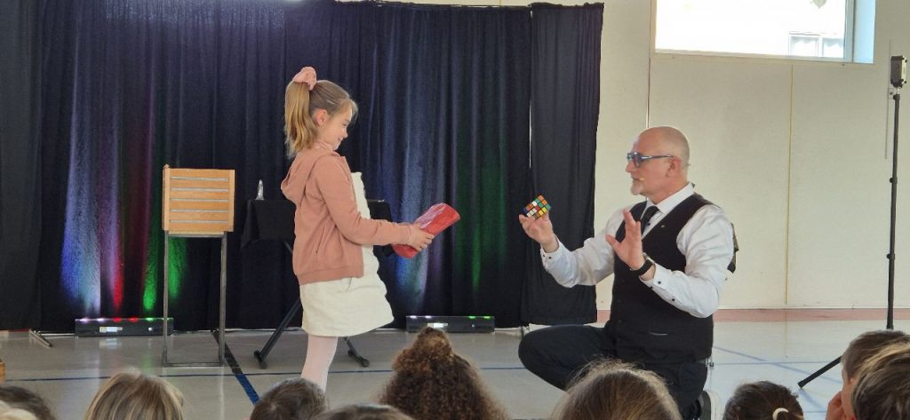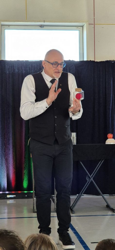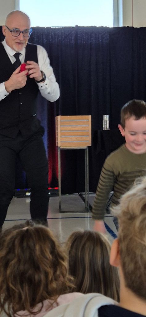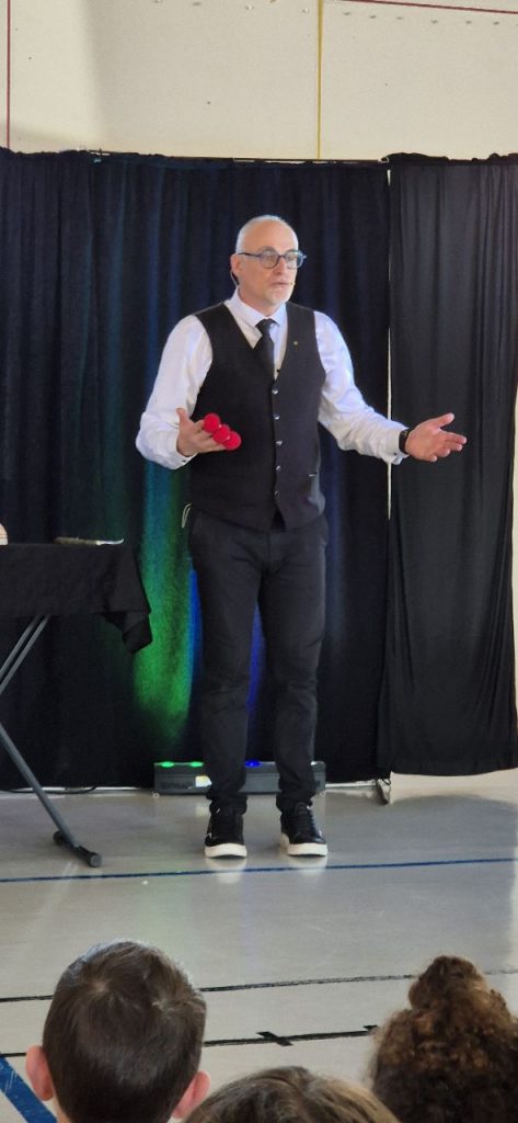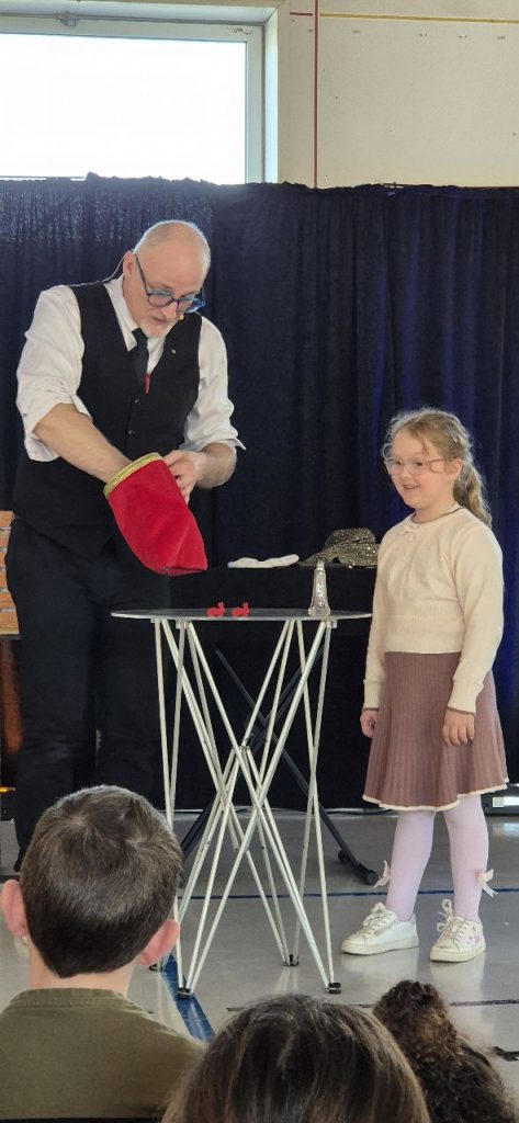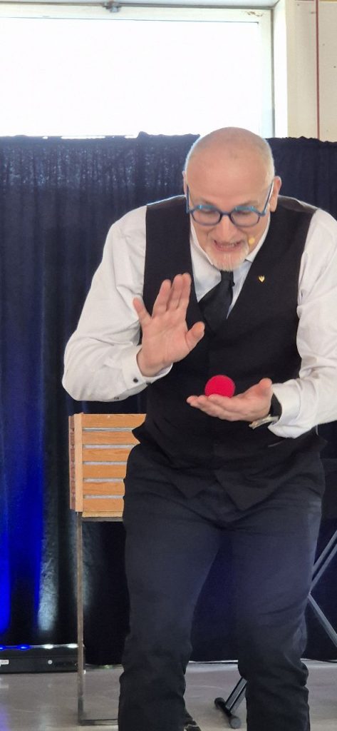 Les enfants, émerveillés, se sont laissés emporter par un univers plein de surprises et d’illusions. Entre rires et regards ébahis, ils ont même participé activement aux tours en lançant des balles… imaginaires ! Et comme par magie, celles-ci reprenaient forme dans des poches en papier, provoquant étonnement et éclats de joie dans toute la salle.