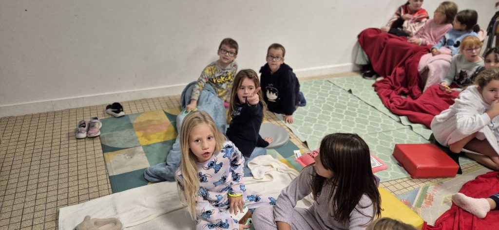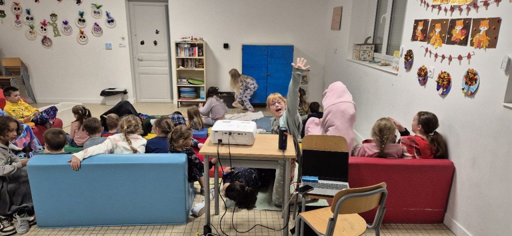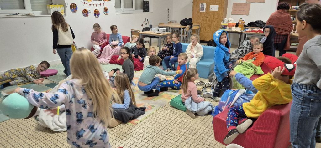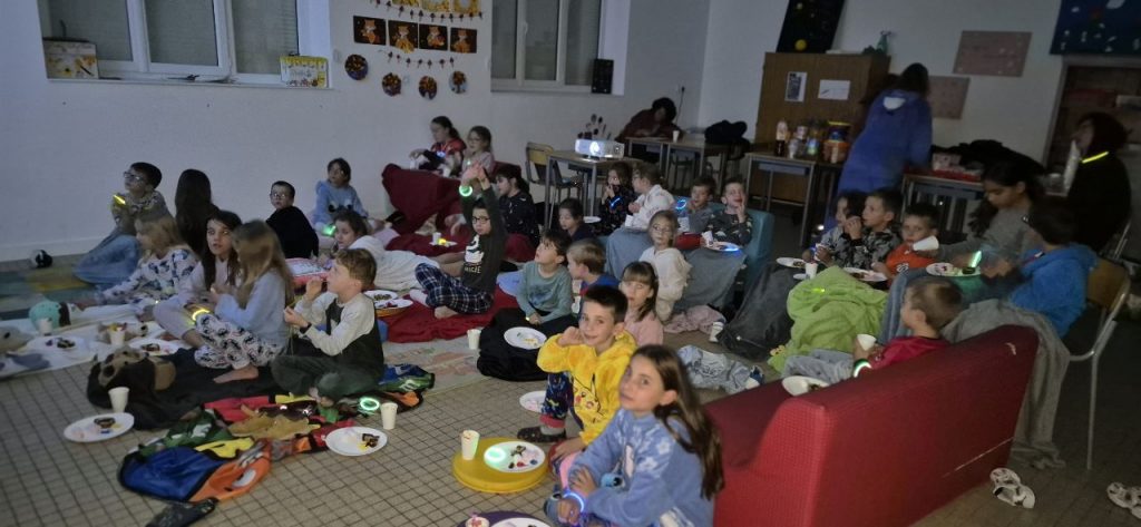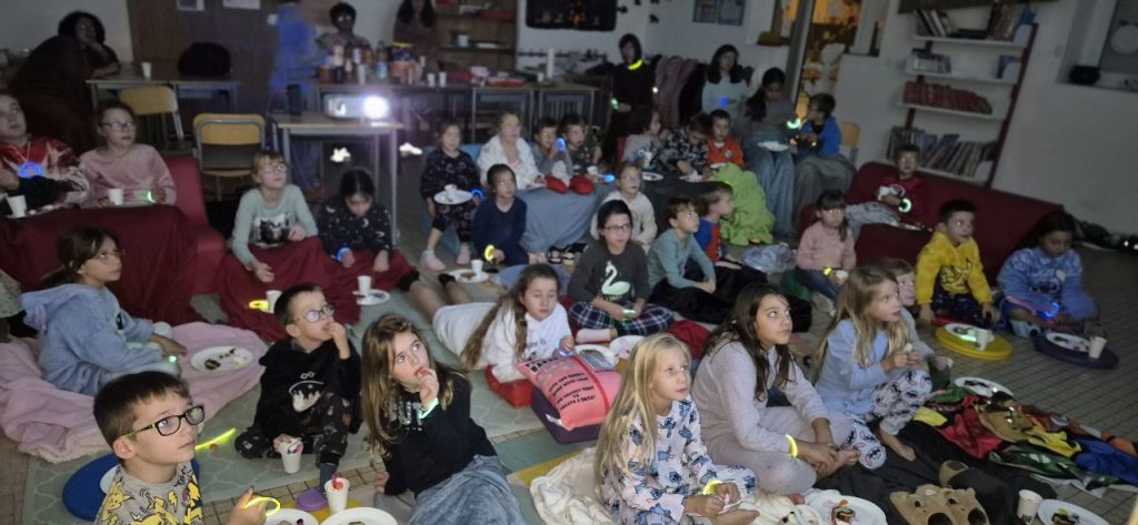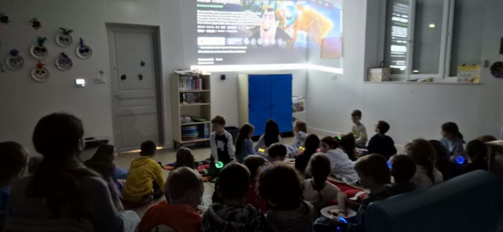 pour la première veillée de l’accueil de loisirs, les enfants sont venus de 19h45 à 21h45 pour une soirée pyjama et projection de film : Hôtel Transilvanie. Les grandes sections ont participé. Les parents ont été sollicité pour emmené boisson jus de fruit et des bonbons ainsi que des pop-corn.